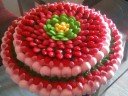 Para la celebración de la Primera Comunión de Sandra, realizamos esta estupenda tarta de dos pisos, con fresones, nubes, manzanas, besitos de fresa y plátanos.